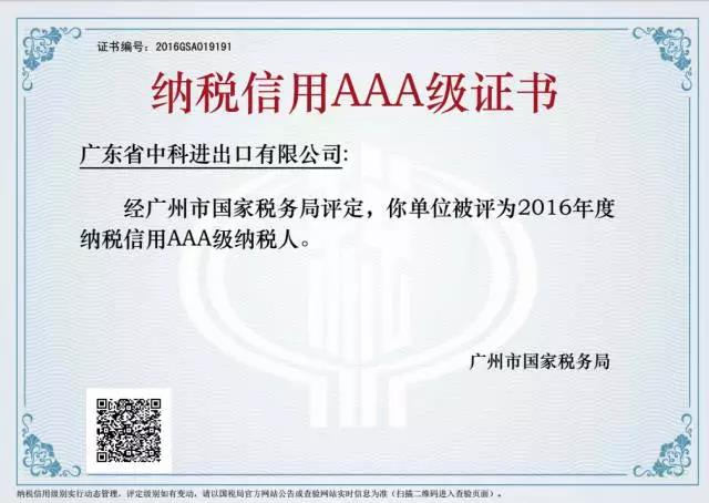 热烈祝贺我司被广州市国家税务局授予2016年度 “纳税信用AAA级纳税人”荣誉称号。