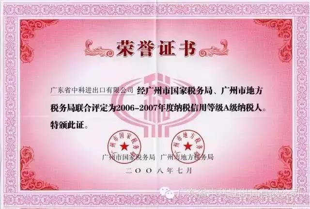 (2006-2007年度A级纳税人荣誉证书)